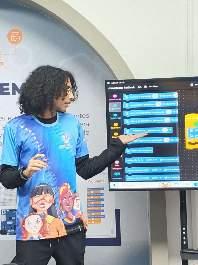 Durante la jornada, los participantes realizaron prácticas de programación en MBlock, aplicando variables, condicionales y lógica para que sus robots interactuaran con el entorno. Culminando la actividad con un examen que evaluó todos los conocimientos adquiridos a lo largo del curso.