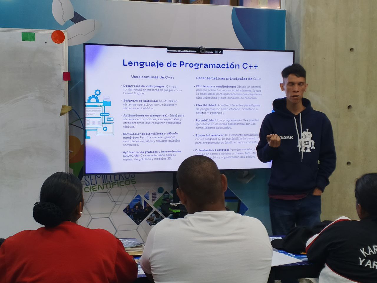 En la jornada de la tarde, se llevó a cabo el curso correspondiente al área de Tecnologías de la Información y la Comunicación (TIC), centrado en el tema del lenguaje de programación C++. Esta sesión tuvo como propósito introducir a los estudiantes en los fundamentos de la lógica computacional, las estructuras básicas de los algoritmos y el papel que desempeña la programación en la automatización de procesos. Los participantes conocieron los principios que rigen la sintaxis y la semántica de los lenguajes de programación más utilizados, reconociendo la relevancia de estas herramientas en el contexto de la innovación tecnológica y la seguridad digital.